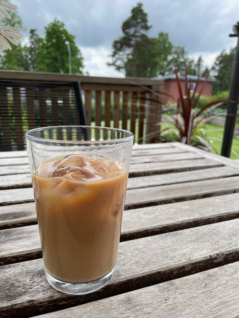 Rullar ihop yogamattan, tar det kalla kaffet från bryggaren, häller kaffet i koppen och blandar med mjölk. Går ut till trappen på verandan och sätter mig. Dricker kaffe och andas. Min storslagna plan på träning skjuts åt sidan för jag vet att de kommande dagarna blir en kamp mellan stressen och lugnet.