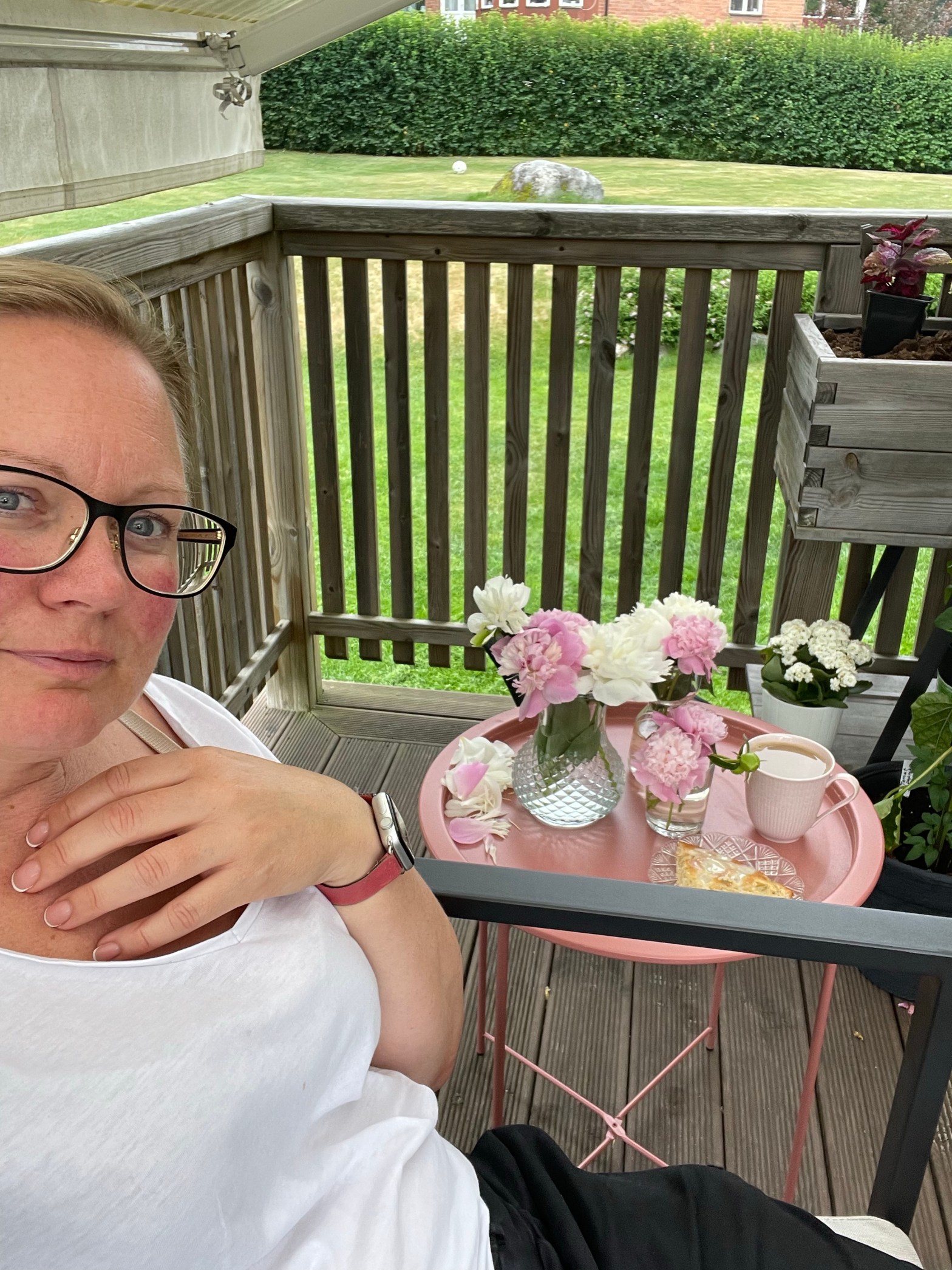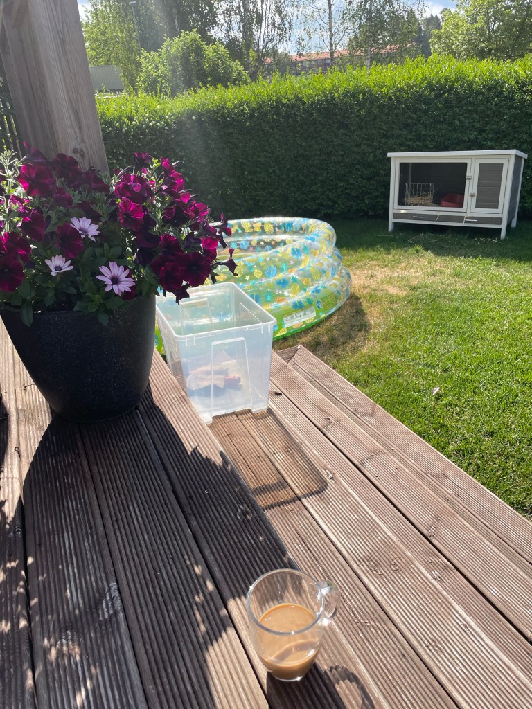 Det är första dagen på semestern, vinden susar i träden, solen bränner mot mina svarta träningsbyxor 9:40. Vakande tidigt, låg kvar och drog mig uppe vid 8. Äter frukost, pratar med maken och yngsta barnet. De stora barnen är på sommarjobb i sin nya kommun.