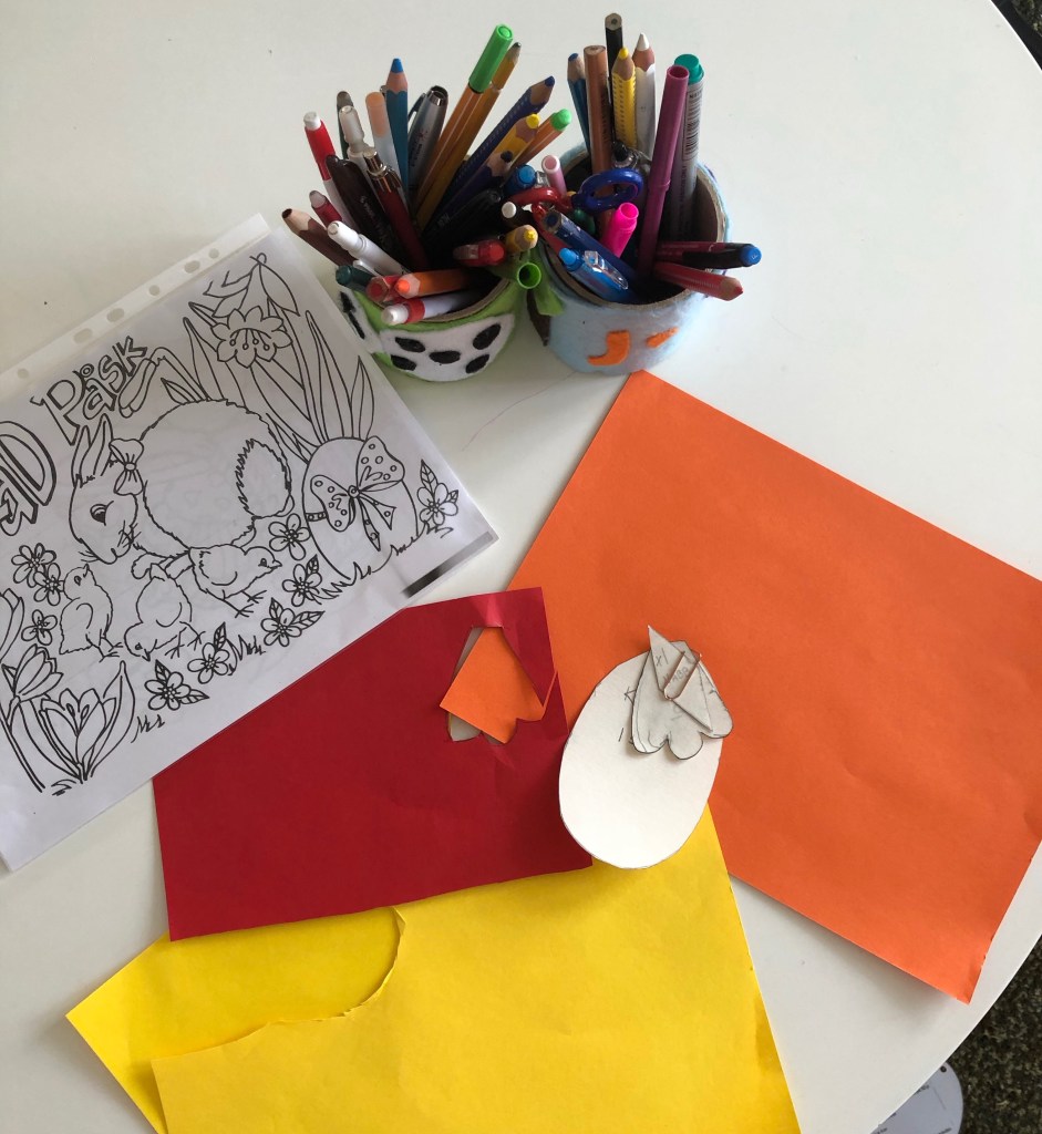 En enkel frukost med kaffe efterfölja med en stunds pyssel. Tog med en mall som jag använt på jobbet med mina 8-9 åringar. Kroppen gick bra att klippa ut sedan blev resterande saker lite för krångliga så Elin ritade av och jag klippte ut. Sedan fick hon limma ihop allt med övervakning av mig så klart #kontrollbehov. Jag tränar på att släppa kontrollen och vissa dagar går det bra andra dagar mindre bra. Söta kycklingar blev det som ska få hänga i påskriset.